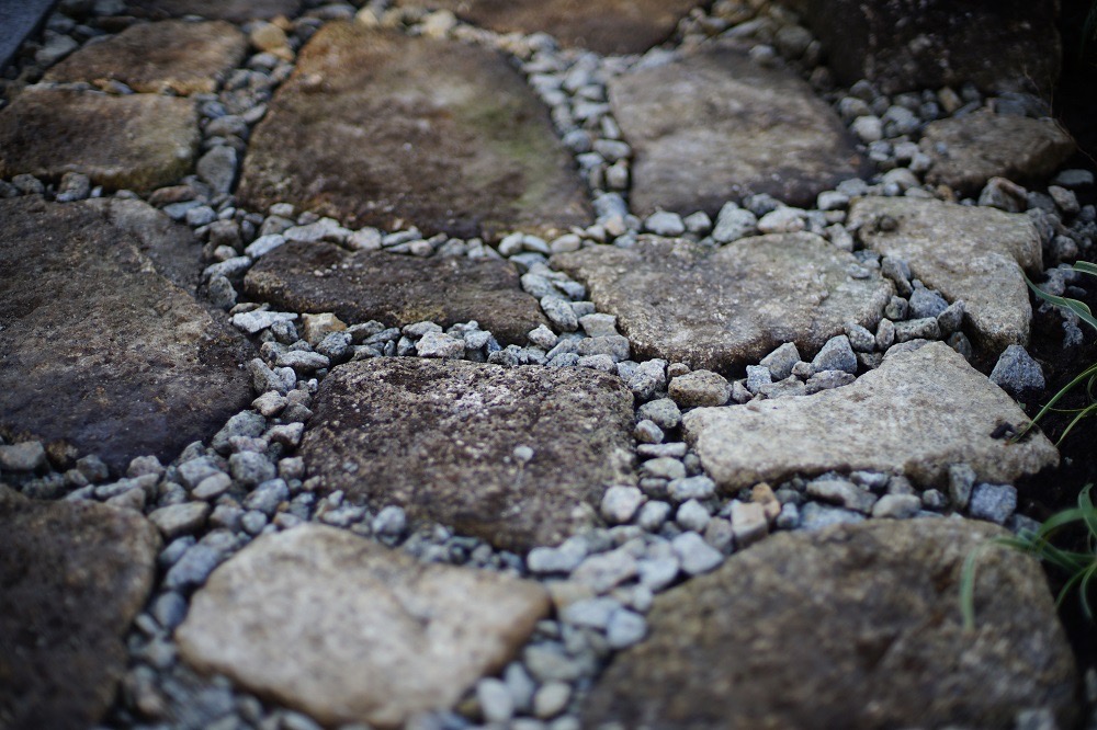 小林賢二さんの手による植栽、石畳のアプローチ。